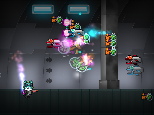 Cyberkat wants to catch some robot fish for dinner. So this cat has decided that it's time to do some space-fishing - using machine guns, laser pistols, and a heaping ton of explosive rockets!