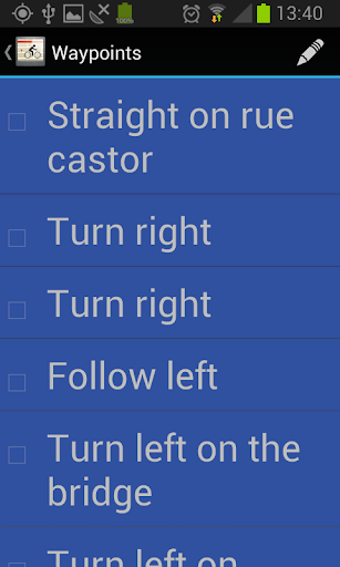8) You can see the list of instructions by hitting the 1st icon from the left and change the order or text by touching the pencil. You can also save it back to the KML file by hitting the floppy disk.