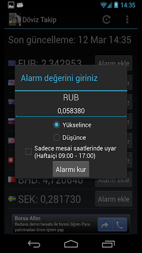 Döviz Takip uygulaması ile döviz değerlerini izleyebilir, dövizlerin değerleri ile ilgili alarm kurabilirsiniz.