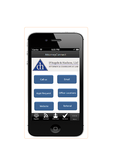 The Greater Boston attorneys at D’Angelo & Hashem offers this mobile app to our clients and friends for direct access to our law firm and attorneys as well as for access to other useful tools and helpful resources such as an appointment scheduler, GPS directions, client alerts and updates, legal articles, and FAQ's. We encourage our clients and friends to download our mobile app to your phone and stay connected with us. Please note, downloading or using our mobile application does not constitute or establish an attorney client relationship.