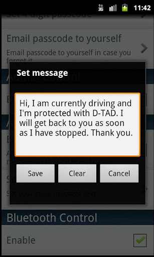 D-TAD is automatically activated when the driver travels above 10mph. When active, only 911 and the 4 pre-programmed numbers are allowed to be called. Texting is completely disabled for as long as D-TAD is active. Texters are automatically notified via auto-reply-text that the driver is currently unavailable and will return calls and messages when he/she has stopped driving. Once the driver has stopped completely, all functions of the cell phone will return to normal.