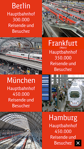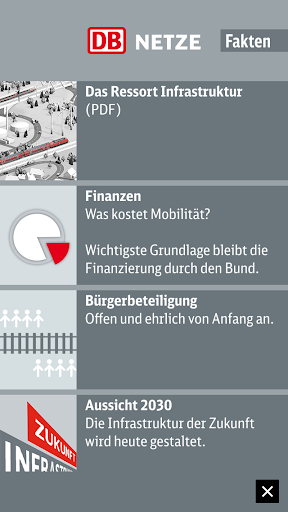 Den Kern der App bilden die vier großen Resorts der Infrastruktur. Spannende Fakten werden mit Videos, Spielen, Animationen, Infografiken, Bildergalerien und direkten Verlinkungen zu den Websites der DB beleuchtet.