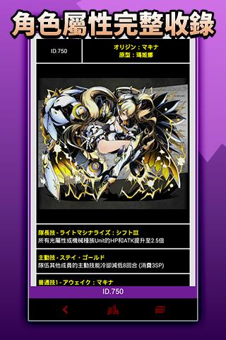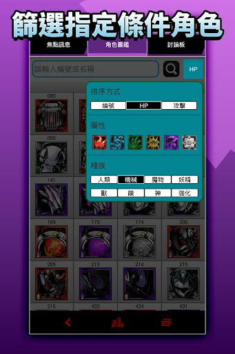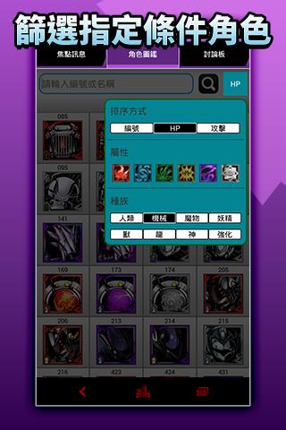 超過200個各具特色的角色詳細數值及進化相關資訊完整收錄,另也提供快速篩選功能,方便玩家迅速挑選出指定條件的角色資料。