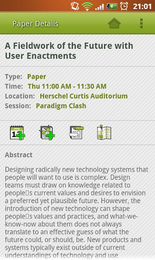 Comfortably organize your personal conference week with your Android device, aided by this application. Browse through conference sessions, papers and participating people, getting additional information where available. Add papers to your personal reading list for later reference. Add events to your personal program and set up alarms where desired. Look up quickly where and when the next session will take place.