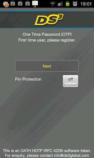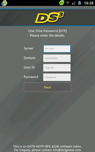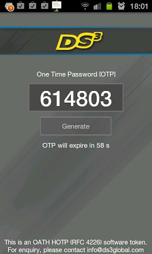 The OathToken application is an extension of the flagship product of Data Security Systems Solutions, the DS3 Authentication Server. This application enables the phone to operate as a RFC 4226 compliant OATH HOTP software token. Using this token, users will be able to achieve 2-factor authentication for remote access login and transaction authorization over the Internet.