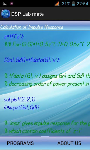 This app contains 12 MATLAB programs regarding basic Digital Signal Processing concepts like Sampling, Convolution, Discrete Fourier Transform,Different types of filter design.