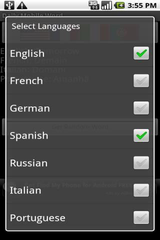 Daily Mobile Word is a fun way to build your language vocabulary on the go. The app provides a new word for you to learn every day in the languages you can choose by pressing the "flag" button. Press "Get Random Word" to receive one of the last 100 words sent to reinforce your learning.