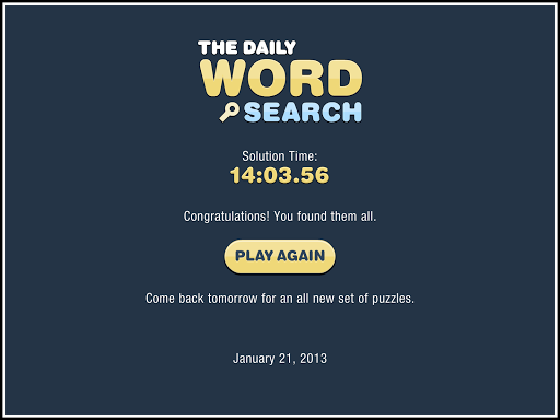 Daily Word Search is the first iOS game from The Article 19 Group Inc, developers of several super-successful online daily games such as The Daily Jigsaw, The Daily Diff, The Daily SNOOP, The Daily Sudoku, The Daily Tangram, The Daily Jigsaw Travel, and The Daily SNOOP Collage.