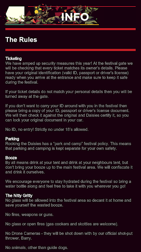 Rocking the Daisies is South Africa's leading music and lifestyle festival. This is the official mobile app for the 9th Rocking the Daisies event, held on 2-5 October 2014, just outside Cape Town. This award winning environmental event production combines the best of local and international entertainment.