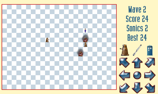 Scoring: Sonic screwdriver = 3x level; Dalek to Dalek collision = 2x level; Dalek to rubble collision = 1x level. Use the TARDIS to teleport to a new location (caution: land too close and a Dalek will destroy you). The Sonic Screwdriver blasts all of the Daleks next to you. Click the Dalek icon for a last stand where all points are doubled.