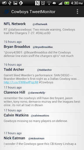 The Dallas Cowboys Tweet Monitor is a completely dedicated Twitter app for everything Dallas Cowboys! A simple tool to keep up with the latest Dallas Cowboys news & online gossip. Built in to this app are over 40 of the best & informative twitter accounts(national media & local beat writers mostly) to follow all about NFL football! Plus, using the player selection checklist, you'll only receive the tweets that mention that player. The rest are filtered out! That way, you control the amount & content of the tweets you view. Great way to find out what not just what the Dallas media are saying but the national media too. Everything is integrated into the app to get up to date Dallas Cowboys info. Nothing from your twitter account is needed or asked for. Perfect for someone who doesn't even care to have a twitter account and just wants the latest breaking news! Go Cowboys!!!