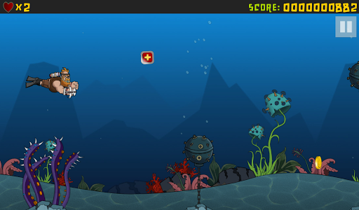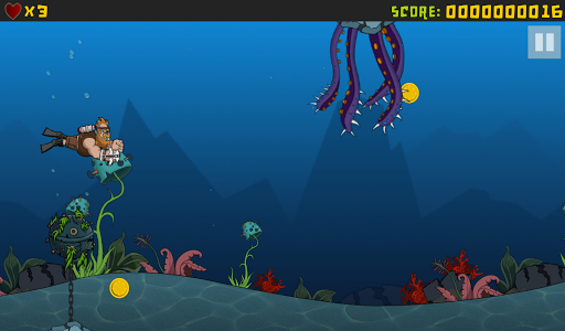 You control our daring hero as he attempts to collect treasure from the ocean floor. Avoid getting whacked by the marauding fish-monsters, tentacle terrors, or the mines and rockets that made their way to the ocean floor!