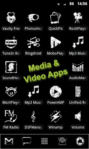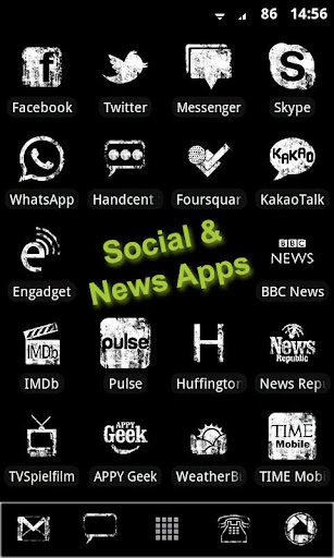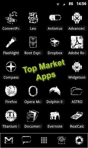 YOU MUST HAVE "LAUNCHER PRO" INSTALLED TO USE THIS ICON PACK! (How to apply: Press menu button on home screen > Preferences > Theme Settings > Icon Pack: Dark Grunge > Restart: Yes!)