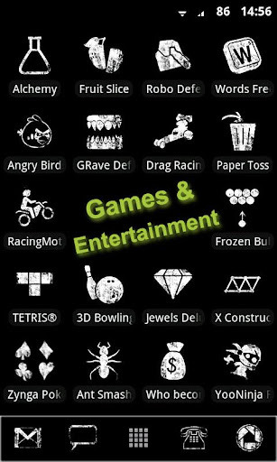 This "Dark Grunge" ink icon theme is intended to be used with a full black background (download here: http://www.arbeitsnenad.com/am/dg_wallpaper.png get the dock here http://www.arbeitsnenad.com/am/dg_dock.png apply via LauncherPro preferences) and to produce as few colours as possible - minimal style.