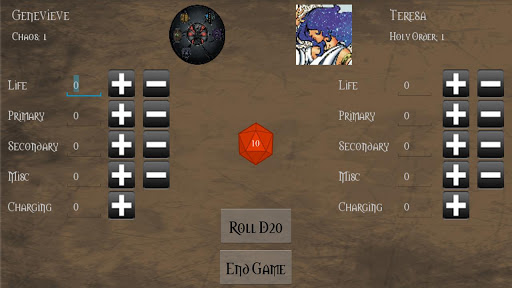 The Dark Legacy app also supplies you with the ability to keep track of your Life Points, Primary Armor, Secondary Armor, Miscelaneous and Charaging counters while you are playing a game of Dark Legacy. If for some reason you forgot your d20 the Dark Legacy app has a built in digital d20.