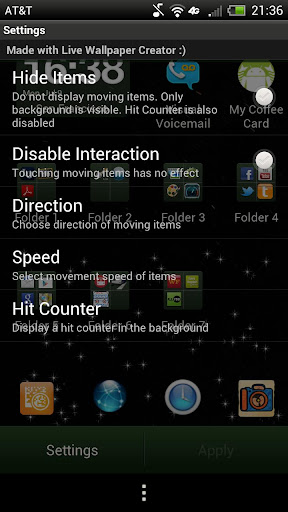 Dark Sky Falling Stars LWP is an interactive live wallpaper app. It features a background counter and allows you to select different speeds and directions for screen items. This app is fully functioning with no restrictions.