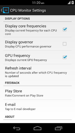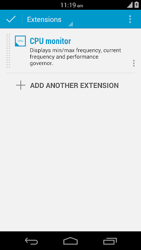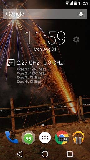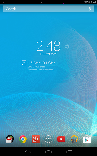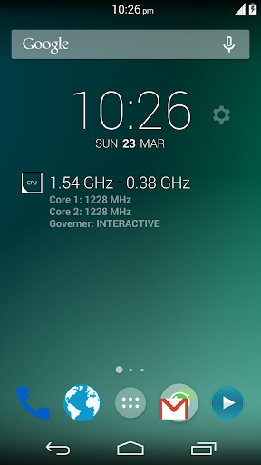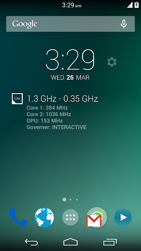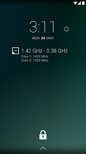 CPU Monitor is a DashClock Extension, which displays hardware states like min-max CPU frequency, performance governor,GPU frequency as well as the current frequency for each core.