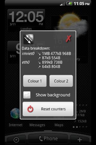 Clicking on the widget will show a breakdown of data received and transmitted. The weird names like 'eth0' and 'rmnet1' are internal Android data interface names. These seem to vary between devices.