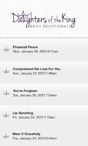 Daughter of the King Daily Devotionals are written by a team of excellent writers. The term “daughter” expresses relationship. When you discover that God loves you simply because of the relationship you have with Him, then you can live free from the burden that performance-based love brings. A daughter of the King is no particular age, race, or ethnicity. She is every woman that has chosen to receive God’s unfailing love and seek everyday to love Him in return. Each devotional is written with the life and everyday concerns of every woman in mind.