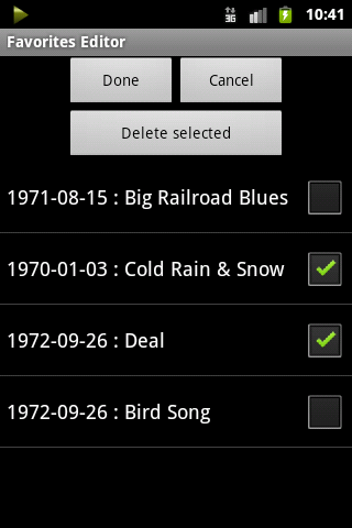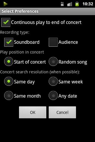 At the push of a button, the app selects and streams a song from a concert played on the current date, week, or month from among the band's 30 years of touring. The simple media player interface displays the concert venue, date, and song title, and lets you navigate through the music - pause and restart playback, skip or repeat songs, go to the start or end of a concert. You can set concert search preferences according to your taste - choose crystal-clear soundboard feeds or rowdy audience recordings, select from your favorite years and decades, pick a random song or listen to an entire concert. And save your favorites for repeated enjoyment.