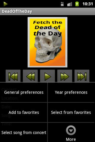 Fetch the Dead Of The Day, from thousands of concerts made available on the Internet Archive by the Grateful Dead and their fans. The Dead Of The Day app provides a simple interface to stream music from the most extensive collection of live recordings ever assembled.