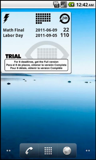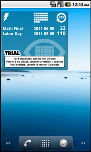From the maker of Checkbook Genius! This is the trial version of the new DeadlineEye widget. You may monitor 1 or 2 events, but there is no time limit and everything else is functional (settings, help, etc.). You're encouraged to play around with the settings and try entering various deadlines! Description below is for the FULL version of the widget. If you like it, grab it - it's cheap!