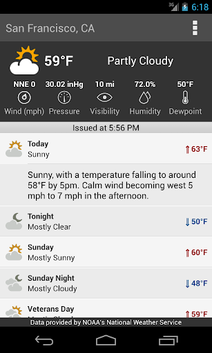 Degrees is a simple and intuitive weather app for your Android device. With information provided from NOAA and Environment Canada, Degrees provides reliable and detailed weather information. Our clean and simple design allows you to quickly view all your favourite locations on a single screen. For detailed information, just tap a location and you will be presented with an easy to use and intuitive screen outlining the current conditions, as well as the upcoming forecast. While viewing details, you can quickly view the radar map and alert details from the convenient slide-down menu.