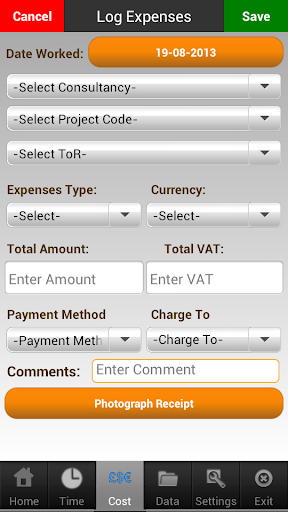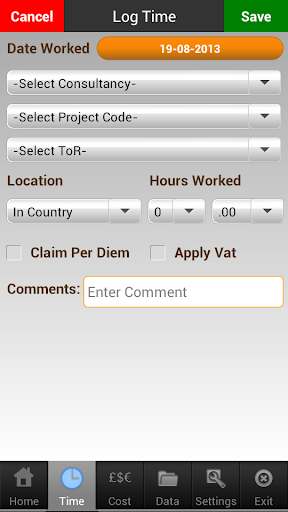 Once authenticated the mobile application allows you to create and store time and expense records on your phone then upload them to the main database when you have a mobile data connection available.