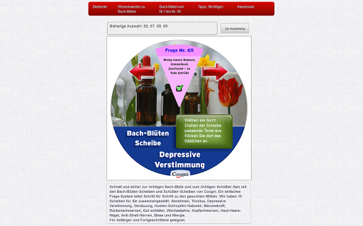 Depressive Verstimmung – Bach-Blüten-Scheibe. Ein schnelles, einfaches Frage-System führt Sie zu den richtigen Bach-Blüten bei depressiven Verstimmungen. Die Coogni-Scheibe.