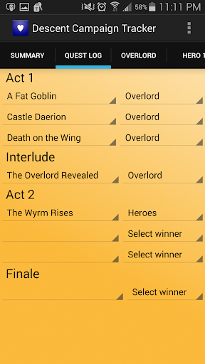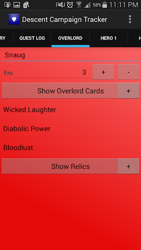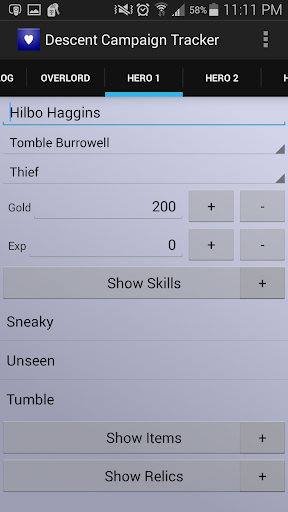 This app is design for use with the Descent 2nd edition:Journeys in the Dark board game. This app will help keep track of the overlord's and heroes' progress during a campaign. After a skirmish, the host can input the gold, experience, items, and skills accrued by the heroes and overlord.