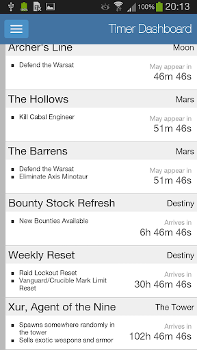 "Destiny Timers" gives you clean, easy to follow timers for every known public event on Earth, the Moon, Venus and Mars, as well as convenient timers for daily/weekly resets such as bounties and raids.