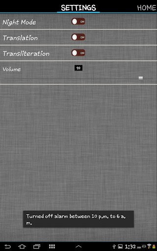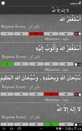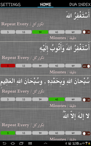 It plays a quiet few second notification that does not cause inconvenience or embarrassment. By default it is set every 15 mins, pronouncing forgiveness "Estighfar". You Can change the timing from 15 mins to 5 Mins or 30Mins or 45 Mins or 60 Mins.