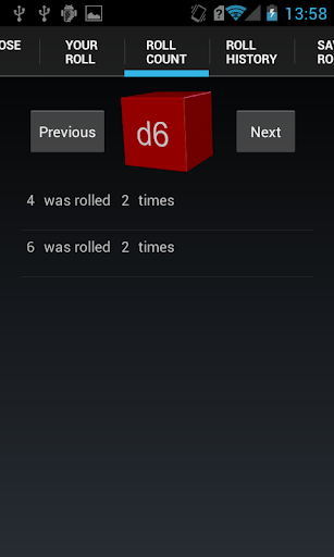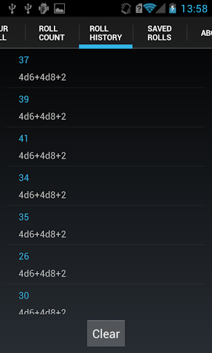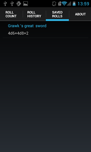 See a count of each value rolled (useful to count number of 6s for example) grouped by dice size. View the total roll and also see what was rolled for each dice size. View the last 50 rolls and see what was rolled. You can also save your roll with a name (eg Grawk's great sword) or remove a named roll. Load a roll by name so it can be rolled again quickly.