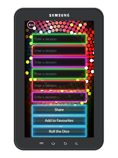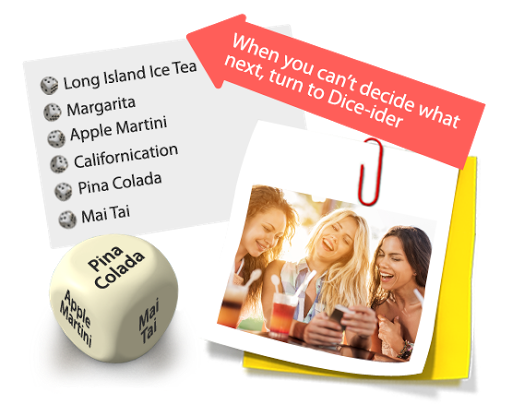 生活中充滿了選擇。無論這些決策重大與否,抑或是能夠決定我們的命運、一連串幸運的開始,以及可能的概率,我們都必須做出決定。而Dice-ider正是為了向您提供幫助。當您與家人、朋友或同事遲疑不決時,Dice-ider讓決策變得更簡單。有了Dice-ider,您可以擺脫這些日常決策所帶來的壓力,只需輸入兩種或多種選擇,這款應用程序將根據您自定義的骰子立即給出答案。然後,您就可以將您的答案分享到Twitter、Facebook和Google+上了。