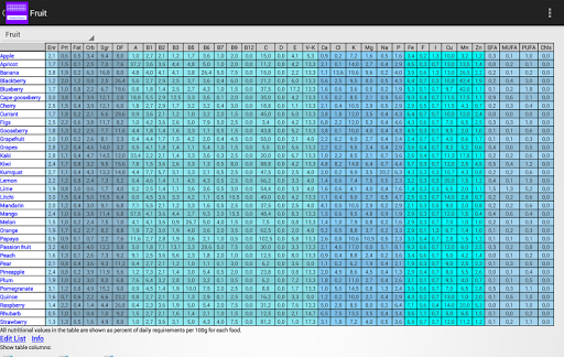 - Nutritional value tables are sortable by nutritional values - so you can analyze and compare food.