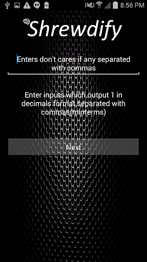 This app takes input of min terms and/or don't cares and using Quine–McCluskey Algorithm it generates boolean expression as output.