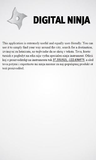 This application is extremely useful and equally user-friendly. You can use it to simply find your way around the city, search for a destination, izvinqvai za latinicata, no trqbvashe da se skriq v teksta. Tova, koeto tursish e pogledyt na edin ninja vyrhu specialen ninja instrument. Otkrii koj e proizvoditelqt na instrumenta tuk 37.331513, -122.030575, a sled tova potyrsi review – “nai-populqrniq im produkt prez ochite na edin ninja”. Good luck!