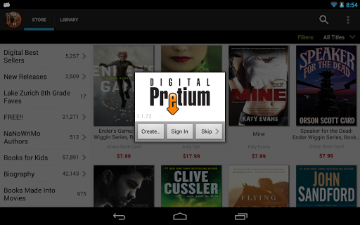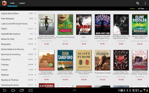Browse and search bestsellers, new releases, lists, popular authors and categories. Access your cloud-based library wherever you go from your computer, smartphone, tablet or compatible e-reader.