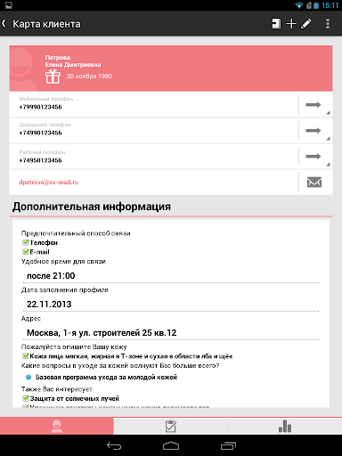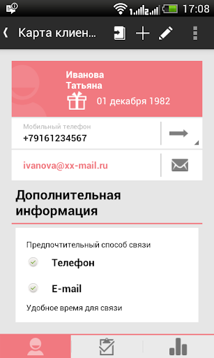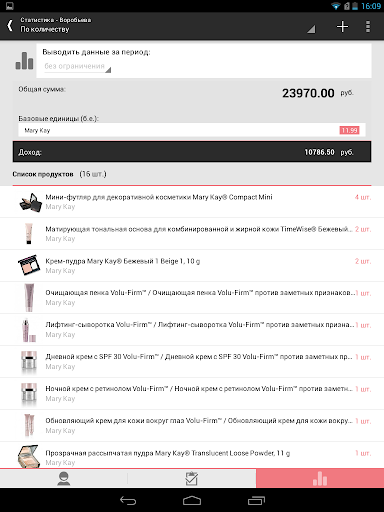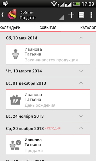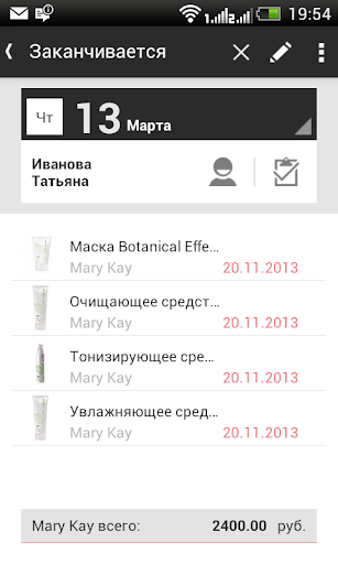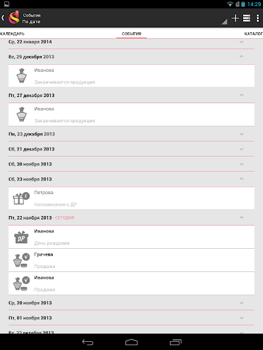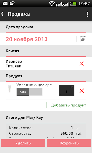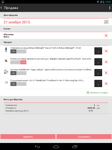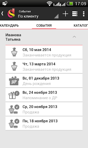 Вы сможете сохранять информацию о сделанных Вами продажах, а также контактную и профильную информацию о Ваших клиентах. Приложение будет информировать Вас о скором окончании продукции у Ваших клиентов и приближающихся днях рождения. В любой момент Вы сможете посмотреть: