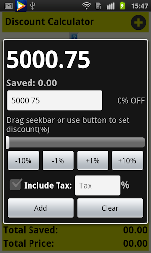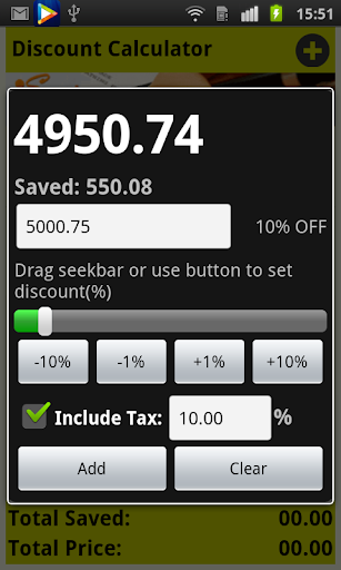 Drag the seekbar or press the ‘-10%’ ‘-1%’ ‘+1%’ ‘+10%’ button to set the discount value quickly, check the ‘Include Tax:’ to calculate a product contain tax after discount.