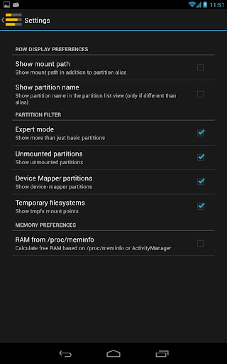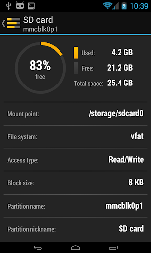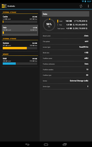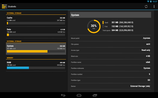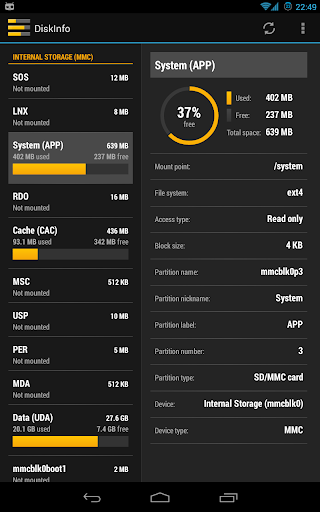 DiskInfo is a unique app that lists all partitions and all mount points on you device. It shows disk usage and very detailed partition and storage information. It also displays total and free memory (RAM) and Swap (e.g. zRam).