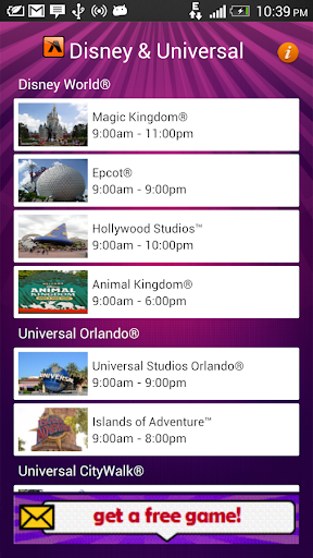 The app features detailed information about Disney World (including Magic Kingdom, Epcot, Hollywood Studios, Animal Kingdom, and Downtown Disney) and Universal Orlando (including Universal Studios Orlando, Islands of Adventure, and Universal's CityWalk).