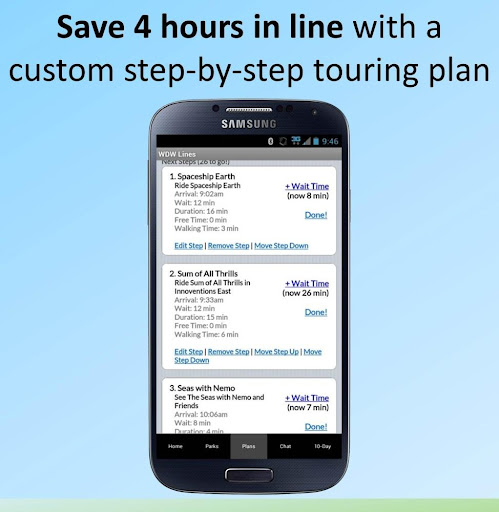 -Customized step-by-step touring plans for each Disney park. You tell LINES which rides you want to see, and LINES will create a step-by-step itinerary showing when to go to each ride to avoid long lines. You can even change your plans while you’re in the park!