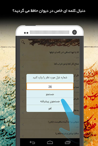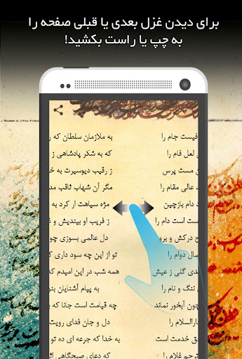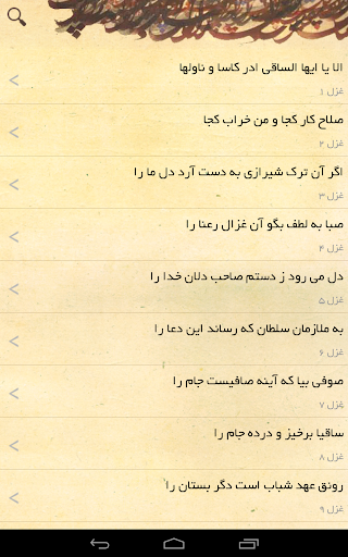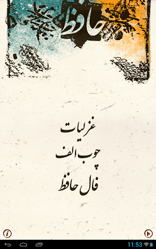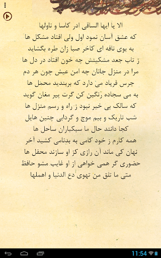 The lyrics are in Persian (Farsi) and beautiful font !!!. You can bookmark (choob-e-alef) your favorite sonnet, share it directly in app. User interface designed base on Persian elements and patterns so you would enjoy it. Divan Of Hafez has great features such: