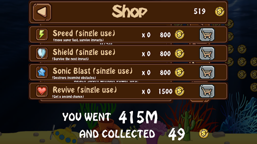 Explore the beauty of deep ocean and collect as much coins as you can. Dive with your cute submarine under water and enjoy your journey. Be careful with the chains and mines. Avoid the torpedo. Do some shopping with collected coins. Have a safe journey.