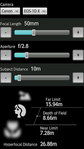 Calculates Depth of Field (DoF), Far Focus Limit, Near Focus Limt and Hyperfocal Distance based on selected camera.