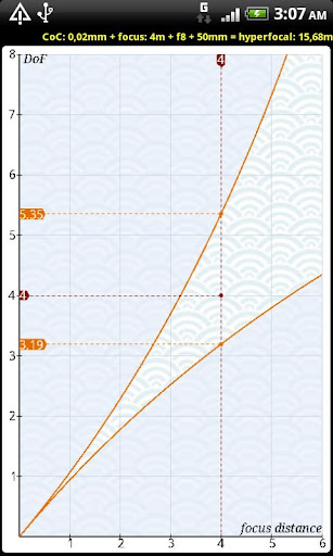 DoF Droid is a simple depth of field calculator that shows in a two dimensional chart the depth of field variation depending on the focus distance of the subject