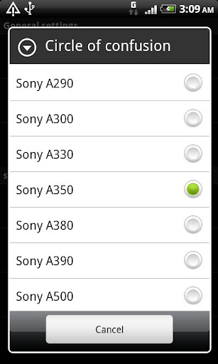 - Large list of supported camera models, DSLR, medium format and custom "acceptable circle of confusion" selection allowed.