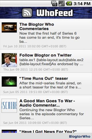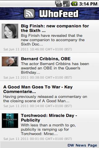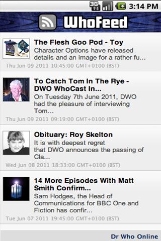 WhoFeed is the only app you need for Doctor Who News - streaming all the latest news, blogs, podcasts and videos from the top Doctor Who websites, right to your device.