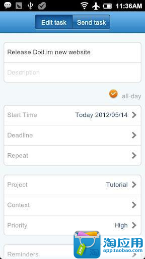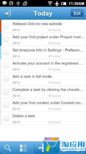 Doit.im [3.6] 1. 遵循Getting Things Done®的理念应用GTD®的五个步骤让您的工作与生活井井有条:收集、处理、组织、回顾、选任务执行。 Doit.im远不止是一个待办列表,而是整个人生的管理家。2. 支持多平台支持Web、iPhone、iPad、Android和Mac, 真正让您在任何时候、任何地点、以任何方式管理您的待办任务。 一切,都可从脑中抛开,只因有了Doit.im.3. 云同步无需担心您数据的安全,他们都在云间。只要您愿意,它们可以自动同步到任何您所使用的平台上。 就是这么简单。